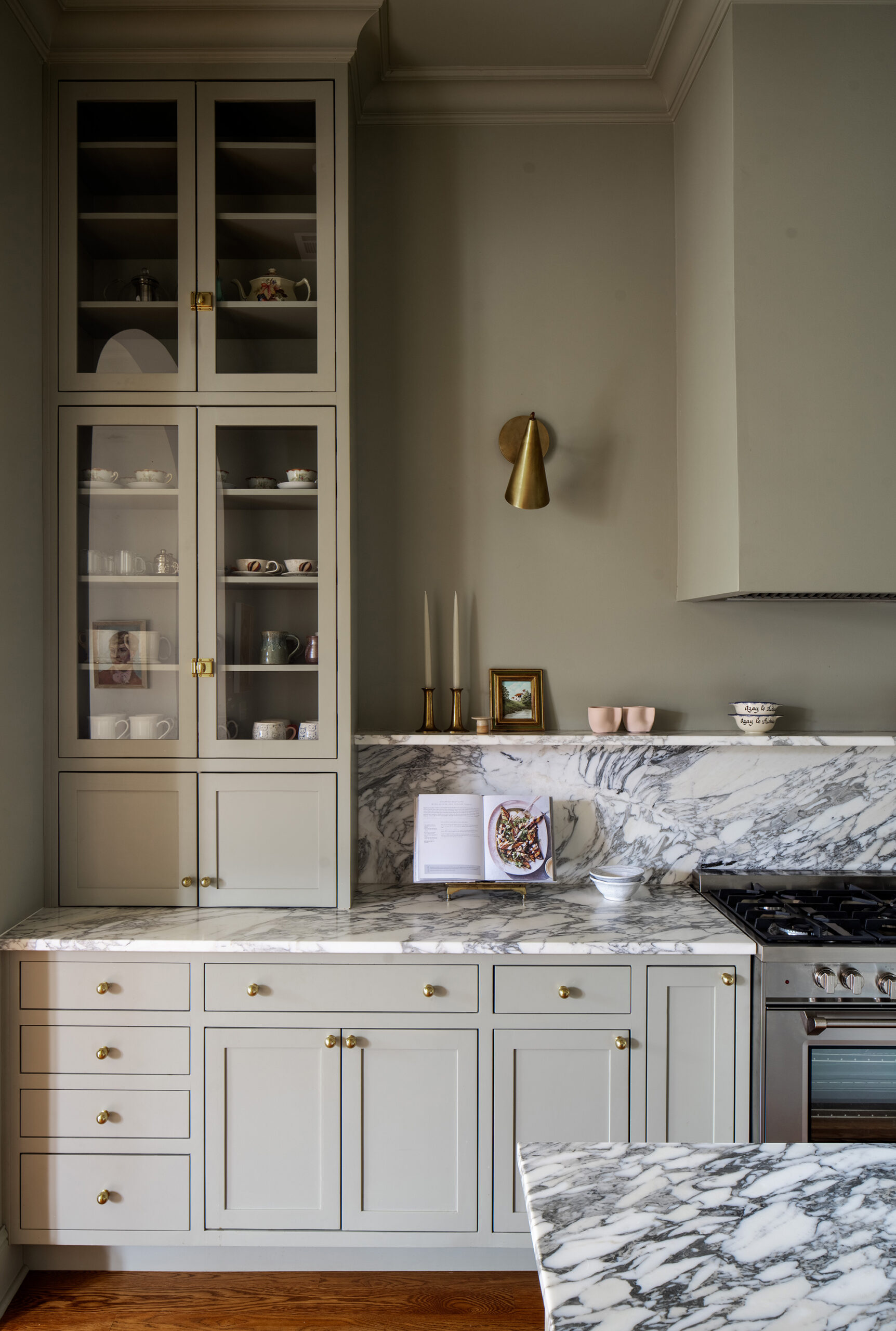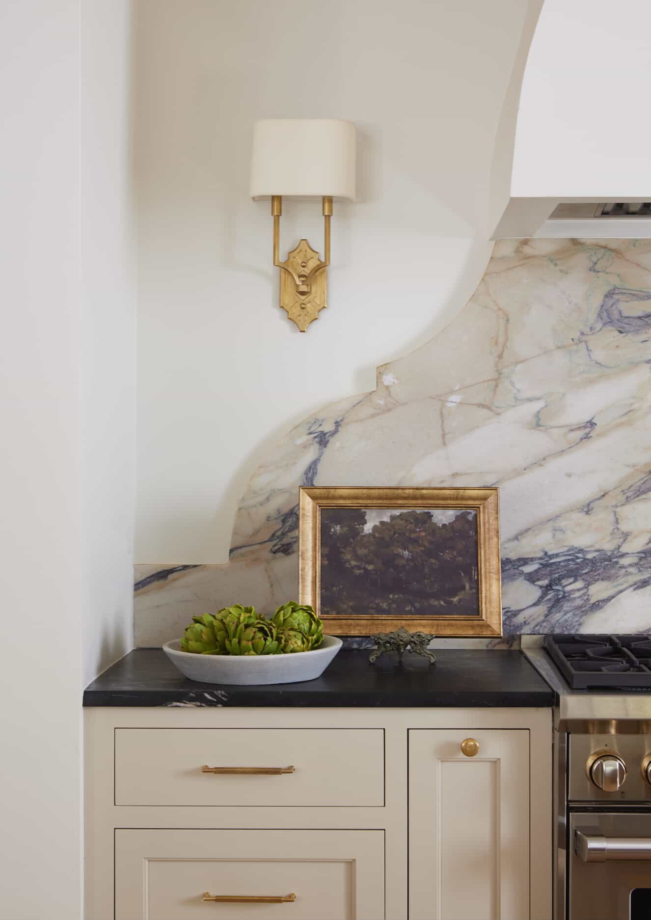Natural stone connects us to the earth with its mineral complexity. Whether it’s the sweeping movement of marble or the subtle texture of travertine, stone brings scale and depth to a room. Wood adds warmth and comfort. Its grain, color variation, and tactile appeal create a living quality that softens cooler surfaces. Brass plays the role of the accent that feels timeless. It captures light, lends richness, and elevates a palette without overpowering it.