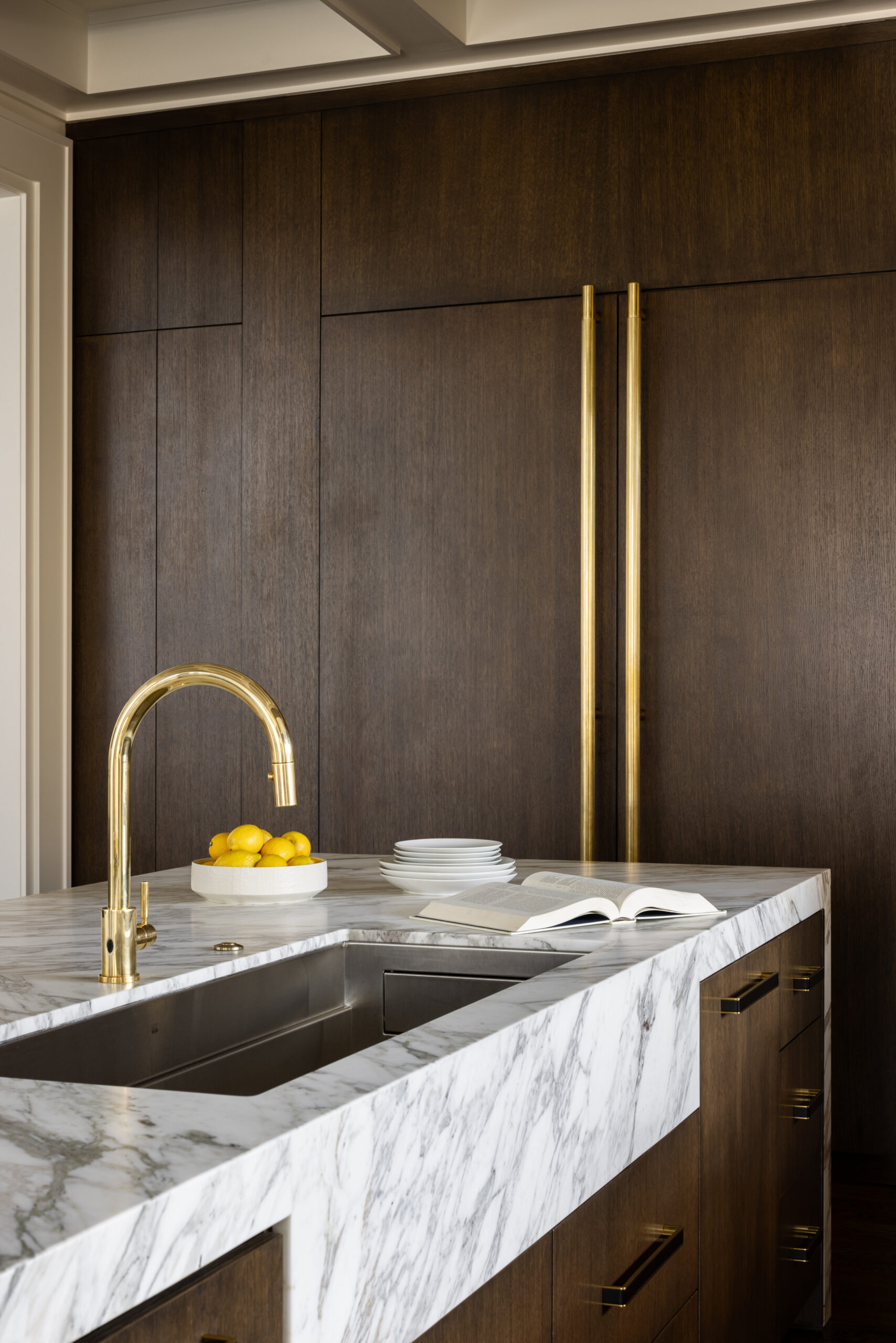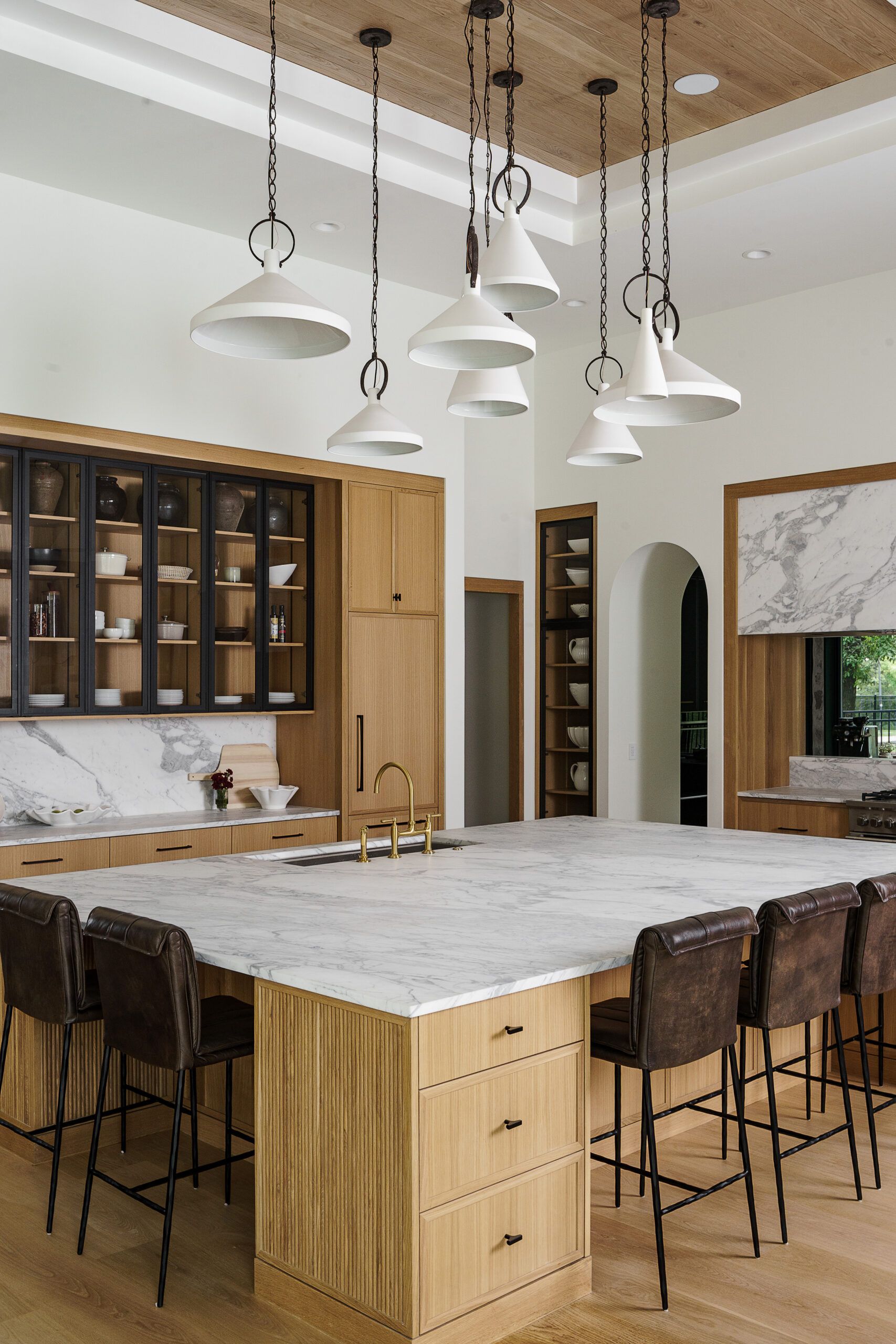 When combining these materials, consider how they relate through tone, scale, and texture. Light to medium wood tones set a warm stage for stone that has movement and depth. A honed finish on natural marble or a soft stone tile complements wood grain without competing with it, and brass fixtures, hardware, or lighting introduce a soft glow that feels both elegant and lived-in. The warmth of brass resonates with the warmth of wood while lifting the overall palette, giving spaces a timeless yet contemporary feel.